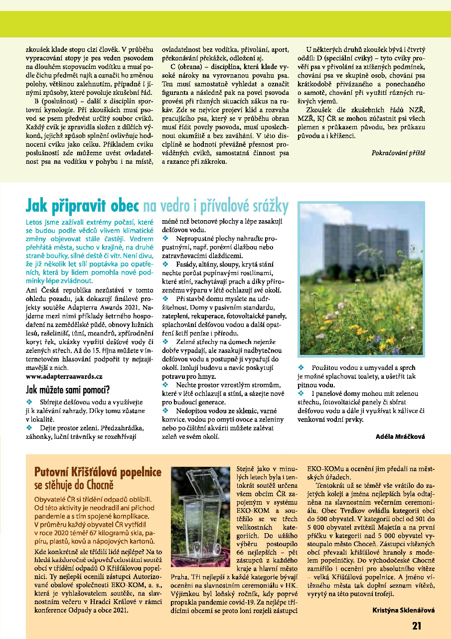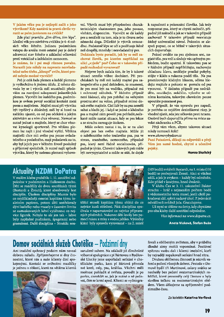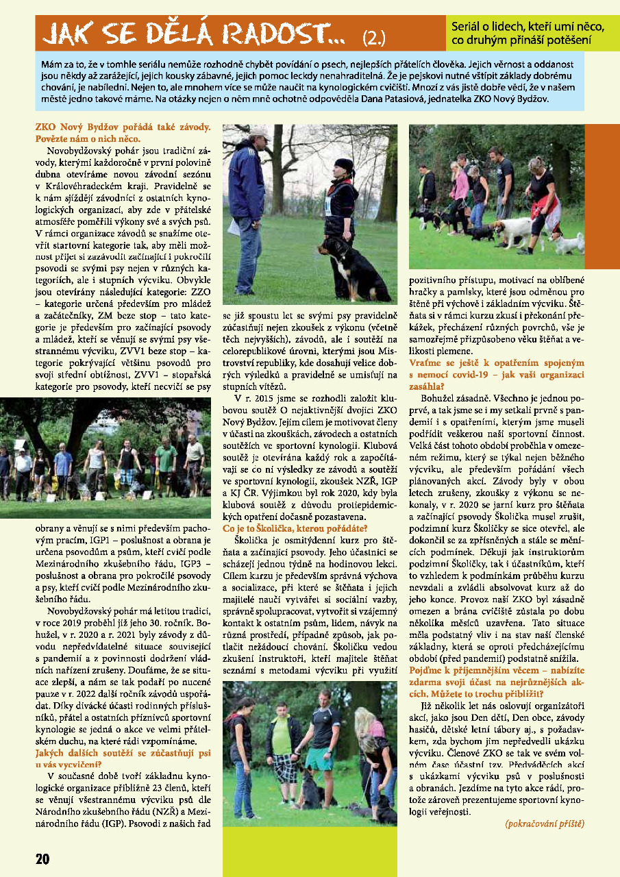 Koncem léta r.2021 roku byla naše ZKO oslovena redakcí měsíčníku Novobydžovský zpravodaj, zda bychom do některého z následujících čísel nezpracovali odpovědi na pár otázek. Ty se týkaly nejen sportovní kynologie a celkového dění v naší domovské ZKO Nový Bydžov, ale i dalších všeobecných témat spojených s pejskařinou. Otázek bylo celkem 17 a postupně na sebe navazovaly. V čísle 10,11,12/2021 vyšly postupně soubory otázek a odpovědí, kompletní příspěvek byl obohacený fotkami našich členů z výcviku a z účastí na kynologických závodech a soutěžích.